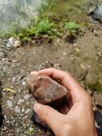 就是一块普通的石英质河卵石,没多大价值,不是玉石。主要化学成分是二氧化硅,其次是少量的氧化铁和微量的锰、铜、铝、镁等元素及化合物。其形成原因是破碎的岩块,经长距离搬运使棱角消失,形成外表光滑的石子,产于各地江河之处,品种繁多,石体花纹有条带状、条纹状、花斑状、波纹状及不规则弯曲条带等,多以黑、黄、青灰色为主,其外形大多圆润有形,表面细润光洁平坦光滑,石质坚实,多数呈不规则块状,具蜡质或玻璃光泽。