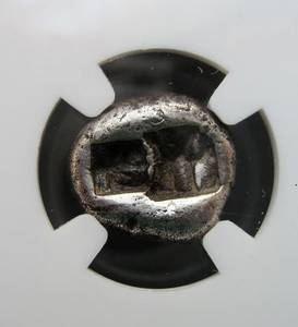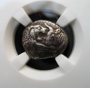 里底亚王赛鲁斯(Cyrus)至大琉斯(DariosI)时期,公元前,公元前561-前546年,Sardes城打制。正面为公牛与狮子相斗,背面两个不规则戳记,当时还没有出现双面币模。这是公认的西方最早的官方发行的银币,市场价值约5000元左右。
