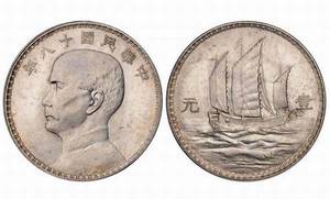 中华民国十八年孙像三帆壹圆银币,共有5国六模(英,美,日,意,奥),皆为试铸样币。因南京国民政府对图案设计不甚满意,所以都没采用。