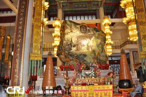 洪大悟真──在观音一侧,鳌鱼摆尾,把几缕淡黄色的鱼尾纹状的玉石抛向上方。来自武汉的德修禅师悟出这淡黄色的玉石构成了隶书体的“真”字。大师临行前,题写了“洪大悟真”四个字,旨在告诉人们:玉佛上出现的奇迹都是真的,让人们用心去悟彻佛法的真谛。