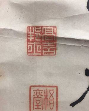 这是两枚篆字方章,上面的是4个篆字,从上向下,从右向左看,是:高(吉,或喜的简化处理)邫士。邫:bāng,古同“邦”。