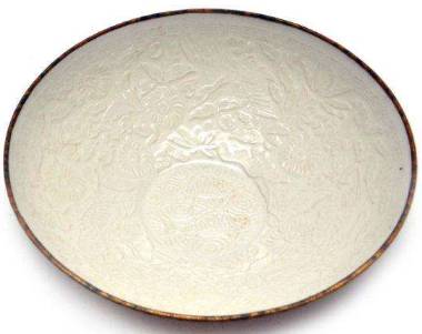 定窑器物,尤其是碗类器物,大都有些变形,假若完好器,将器物倒扣于桌面,便很简单发现这一特色。