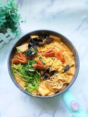 纯牛奶,方便面饼,芝士片,火锅底料,喜欢吃的素菜
