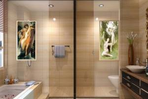 还有一个投机取巧的办法,就是选用与墙壁粉刷颜色一致的厕所门。这样子在视觉上会忽略厕所门这一存在,误认为那是一面墙壁,从而不会产生心理负担。在厕所门上挂一束干花、贴一幅壁画,也是极好的创意。处于厕所的需要,厕所门不能设置成完全密闭的状态,需要留有透气孔,因此,透气孔的位置也需要精心设计。