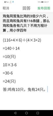 分析:设鸡有x只,则兔子有(3x-6)只,根据腿的倍数关系:兔腿的条数+鸡腿的条数=116,可列方程解答即可。