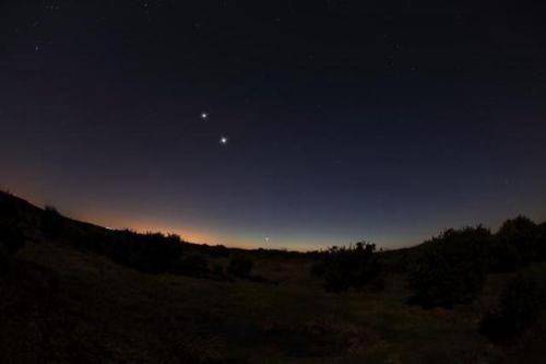 不过有个坏消息,这次的土木相合属于大合,但它最近时发生在晚上9点半前后,那个时候,我国境内已经看不见木星和土星了……因为现在木星和土星比较靠近太阳,在日落后一个多小时就会沉入地平线。不过晚上19时到晚上21时半也就大约只有2个半小时了,两颗星已经靠得足够近了。