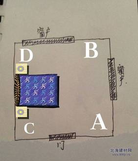 第二方案:只放一个床头柜,可以把床放在A处,床尾朝向B处。C\D这面墙可以放置大衣柜。有电视柜的话,可以放在BD中间的位置。