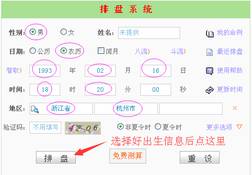 假如:某男于农历 一九九三年二月十六 晚上18点20分出生浙江省 杭州市。那么他的生辰八字是:癸酉 乙卯 戊子 辛酉。八字中五行缺火。
