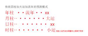 传统四柱八字预测模式也就是四柱加大运加流年的预测模式,因为传统上小运的起法失误,基本上放弃不用。下面再了解刘玉珍张睿老师是怎么一步一步完善四柱八字的算命模式的。