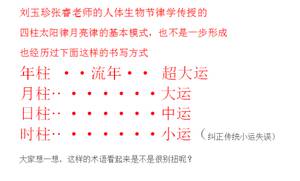 虽然刘玉珍张睿在实践中除了纠正传统小运的失误后,第一个全新的成就是发现了中运;但是在实践中,依然还存在一些不能完全解决的命理问题;所以刘玉珍张睿老师就想,为什么有反映月柱变化的大运、有反映日柱变化的中运,有反映时柱变化的小运,为什么就没有反映年柱变化的“超大运”呢?有了假设以后,就需要在实践中去证实了。于是完整的四柱预测模式基本上完成。但是,明白人都明白,这种超大运与大运中运小运组合在一起是不是很别扭呢。于是刘玉珍张睿老师就采用了节律这一术语,就有了人体生物节律学传授的四柱太阳律月亮律全新的预测模式: