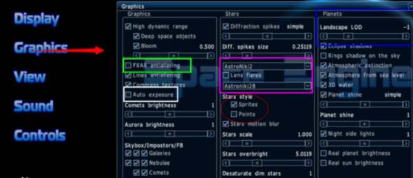 圈圈部分为星星模式,点、或线的显示,这个我也不知有啥效果,不过2个勾勾都能打勾,完了之后星星会亮那么一点最后的蓝色框,那是行星纹理密度,越高生成的越精细,看到的越真实,这就是为啥别人截出来的行星图片比你表面的更变态,越高越吃硬件啊,电脑不行的又想流畅玩的,调到负数也会有很大帮助
