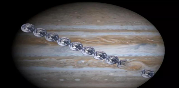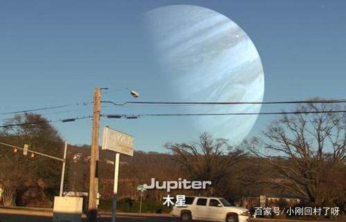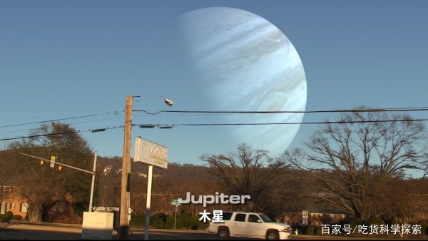 如果说将海王星和天王星放到月球的位置,仅仅是让人感到压迫的话,那么将直径142984千米、体积是地球1300多倍的木星放在那,人们将直接感受被巨行星支配的恐惧。