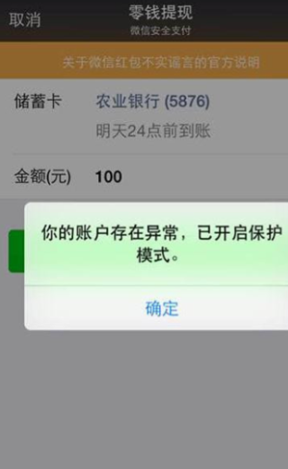 1、对微信进行测试,看是否可以提款,发现不可以提款,提示异常。