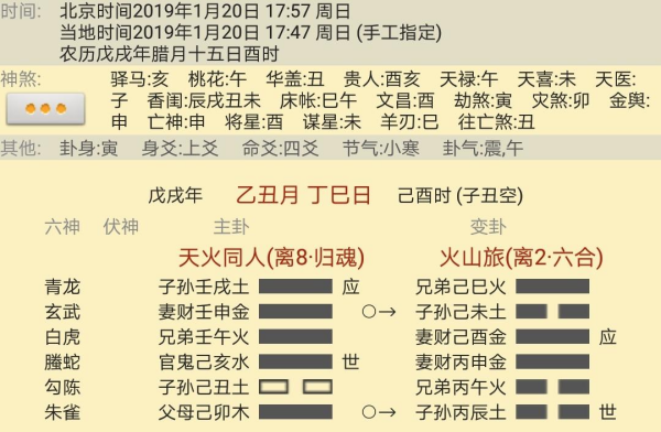 卦主与大多数人一样不知道六爻断卦对问法要求与重要性,所以说的太简单了,这样对准确断卦就带来很大的难度。因为用六爻测婚姻大致有三种情况,一是已婚测今后婚姻发展情况;二是未婚问什么时候会有对象;三是未婚问与正在谈的对象成不成。如果用四柱测婚这样问就行了。因此建议卦主将问题说清楚,大家才可以详细地帮你解卦。目前只能是大致解答如下: 1、《火雷火雷噬嗑》就如别人已咬过的东西,没有什么好味道了,食之无味,弃之可惜。 2、卦主自身条件不错,能说会道。假如已婚的,则老公同样条件很好,长得英俊,一表人材,在别人眼里你们是很相配的。如果是未婚的,正在谈对象,那么该对象综合条件不如卦主,不理想。 3、卦中财爻临玄六爻!请大师解卦!