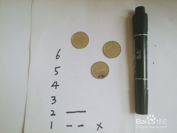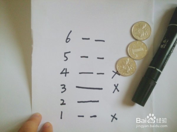 小编的第一卦为老阴爻,也就是变卦。我们在后面打个x做记号。(三反)