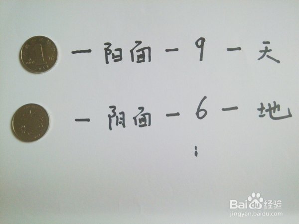 正面,也就是写字的,为阳面,对应数字9。代表天。