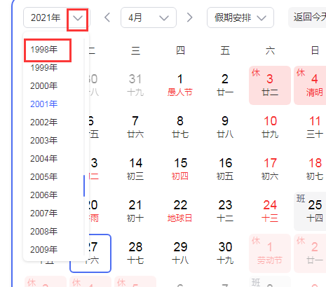 三、 点击展开万年历年份,找到对应的出生年份,并点击跳转到该年份,同样的方法跳转到出生月份。