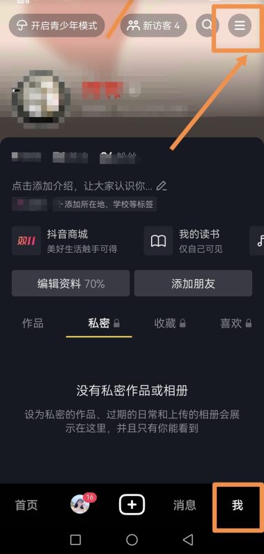 1.打开抖音我的个人页面,选择右上角【三】,如图所示:
