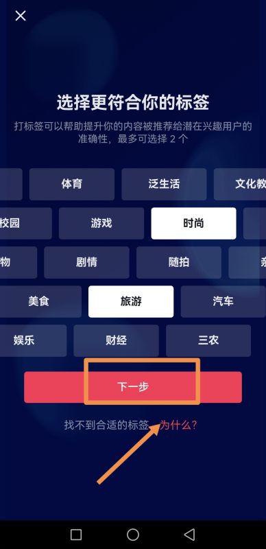 4.然后在这里选择两个符合自己的标签,点击【下一步】,如图所示: