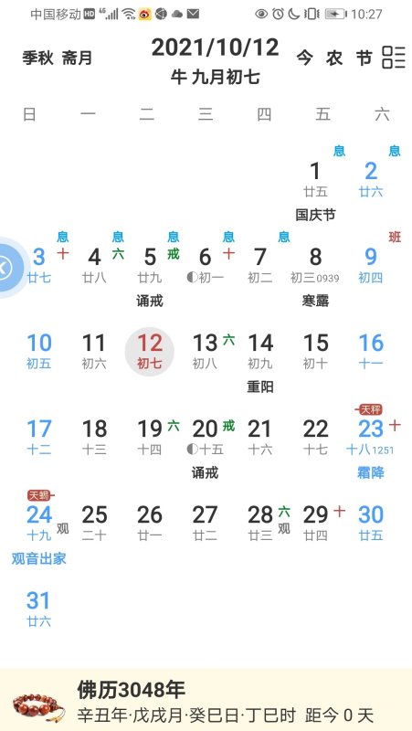 详如下图。譬如今天,是农历4718年九月初七,阳历2021年10月12日。