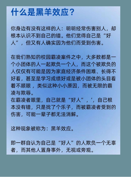 黑羊效应:一群人欺负一个人,其他人却坐视不管的诡谲现象被称为“黑羊效应”。