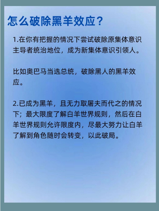 1.在你有把握的情况下尝试破除原集体意识主导者统治地位,成为新集体意识引领人。比如奥巴马当选总统,破除黑人的黑羊效应。