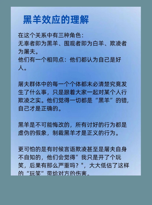在这个关系中有三种角色:无辜者即为黑羊、围观者即为白羊、欺凌者为屠夫。他们有一个相同点:他们都认为自己是好人。
