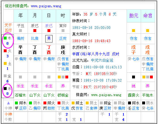 现举一个例子说明。假设有一女命于农历 一九八一年八月十九日 晚上八点出生,其生辰八字是:辛酉 丁酉 丁酉 庚戌。根据上述讲的五行属性来分析统计,就可以知道她的生辰八字中五行中缺少水、木两种五行。五行分布详细情况如下图: