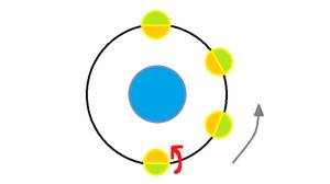 如图,中间蓝色是地球,灰色箭头是月球公转方向,红色箭头是月球自转方向。