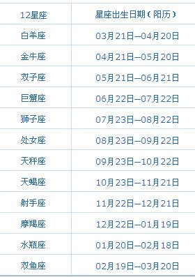 亲爱的楼主,您好!星座的查询其实很简单的,下面是12星座对应的日期,希望对您有用: 水瓶座 1月20日-------2月18日 双鱼座 2月19日-------3月20日 白羊座 3月21日-------4月19日 金牛座 4月20日-------5月20日 双子座 5月21日-------6月21日 巨蟹座 6月22日-------7月22日 狮子座 7月23日-------8月22日 处女座 8月23日-------9月22日 天秤座 9月23日------10月23日 天蝎座 10月24日-----11月21日 射手座 11月22日-----12月21日 摩羯座 12月22日------2007.5.12.出生男孩什么星座,是公历5.12.