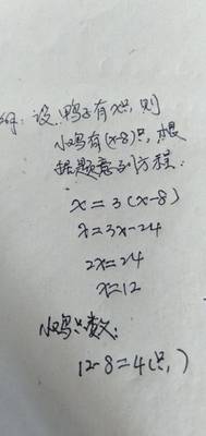 鸡有12只,鸭有4只。 鸡的只数是鸭的3倍,再加上鸭子本身的数量,16只里面就相当于有4倍鸭子的数量。16除以4等于4,这样4就是鸭子的数量。鸡是鸭子的3倍,鸡就是12只鸭子的只数是小鸡的只数的3倍小鸡比鸭子少八只鸭子小鸡各几只解方程怎么做?