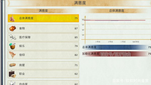 居民满意度居民的满意度有很多方面,可以点击“年鉴”在点击“满意度”查看,其中包括食物、医疗、娱乐、信仰、住房、工作、自由度和安全度。其实这些都是基本的东西,简而言之就是“缺什么补什么”。比如食物满意度低,就增加食物的多样性(栽种多种食物、生产或者进口多种食物),增加杂货店和超市;医疗满意度低就增加医院和诊所等等,笔者也不必赘述。