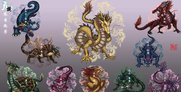 长子囚牛,次子睚眦,三子嘲风,四子蒲牢,五子狻猊,六子霸下,七子狴犴,八子负屃,九子螭吻。上古凶兽为饕餮、穷奇、梼杌、混沌。