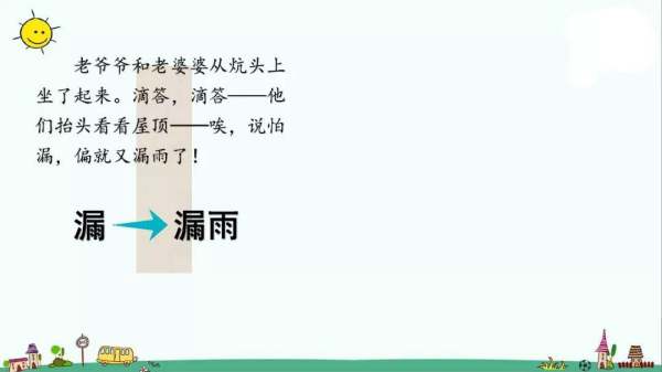老公公和老婆婆从炕头上坐了起来。滴答,滴答——他们抬头看看屋顶——唉,说怕漏,偏又漏雨了!