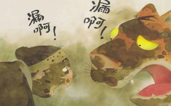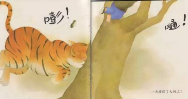 这时老虎慢慢转过头来想看看“屋漏”是不是走了,谁知没看见“屋漏”,却看见一个人在树上,才知道自己上了当,调转身子猛向大树扑去。