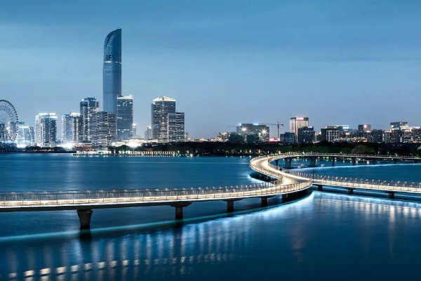 金鸡湖(Jinji Lake),位于江苏省苏州市老城区东北部、苏州工业园区中部,南邻独墅湖,中心位置处于北纬31°18′,东经120°42′,水域面积7.4平方公里。金鸡湖属太湖支流,有进、出水口10余条,北纳娄江之水,西受相门塘、葑门塘来水,出水主要通过斜塘河泻入吴淞江,故属吴淞江水系。