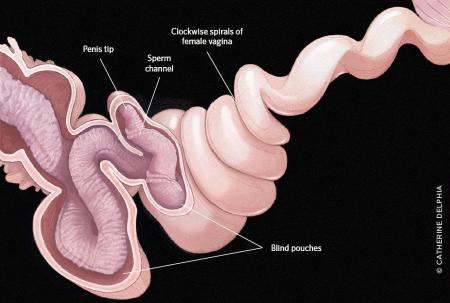 雌性面对这种情况,也没有坐以待毙,它们进化出了完美应对策略,也就是结构非常复杂、且成顺时针螺旋(因为雄性是逆时针螺旋),布满死胡同的生殖器。